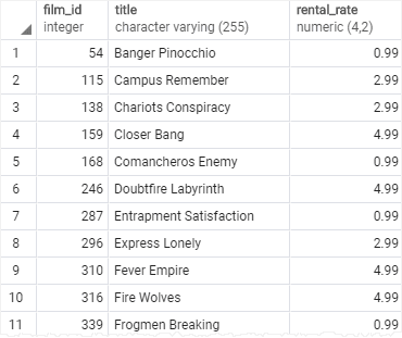 The following statement uses the SELECT INTO statement to create a new table called film_r that contains films with the rating R and rental duration 5 days from the film table.